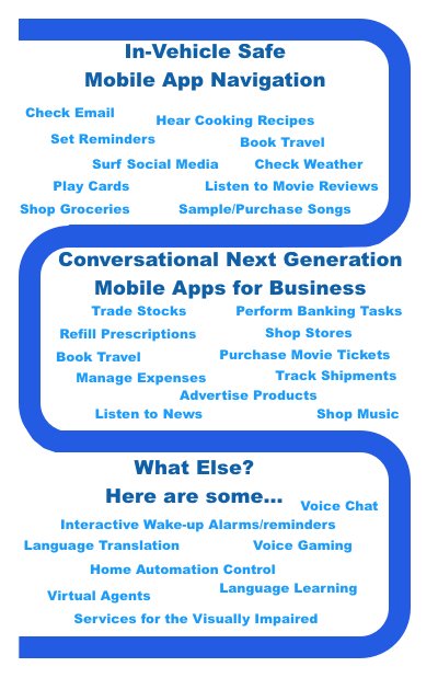 Today, there are thousands of applications that span multitude of industries. While these applications continue to increase in number and in functionality, most require users to use their hands and eyes for interaction. Conversational speech interactions, blended with other user interaction modes, are ideally suited to transform most of these applications to become conversational, intelligent and fast; A user and an application interact using speech without requiring the use of keyboards, hands, and without needing to look and focus at a screen.